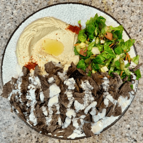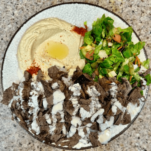 Our perfectly seasoned and tender beef shawarma is topped with a rich, creamy tahini sauce that enhances every bite. This satisfying dish is served with a side of fluffy rice, smooth and flavorful hummus, a fresh and crisp salad, and warm, soft pita bread.