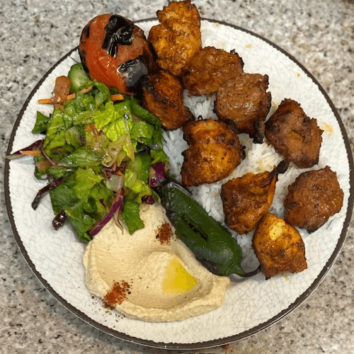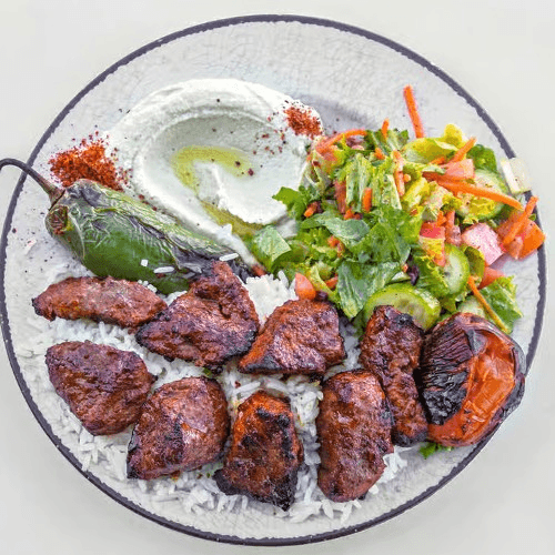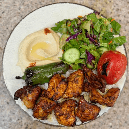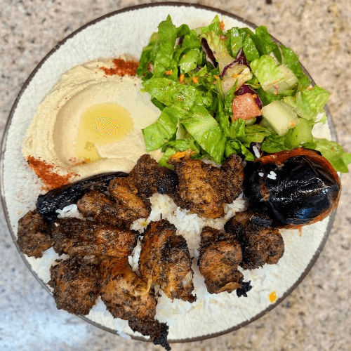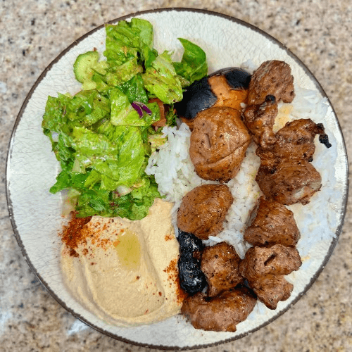 Featuring tender, marinated steak pieces grilled to perfection. served with fragrant rice, creamy hummus, and a fresh salad bursting with crisp lettuce, a grilled tomatoes, and grilled jalapeño with warm, soft pita bread.