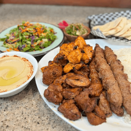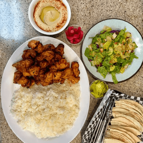 Choose any three of our savory meats and enjoy them served alongside a generous portion of fluffy rice, creamy hummus, a fresh salad, and warm pita bread.