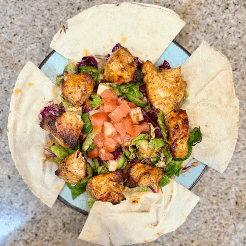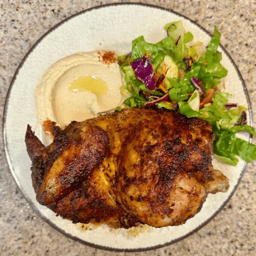 featuring juicy, marinated chicken grilled to perfection. served with fragrant rice, creamy hummus, and a fresh salad bursting with crisp lettuce, a grilled tomatoes, and grilled jalapeño with warm, soft pita bread.
