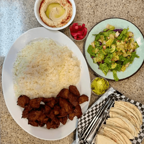 Featuring your choice of two delicious meats served with a generous helping of fluffy rice, creamy hummus, a fresh, crisp salad, and warm, soft pita bread.