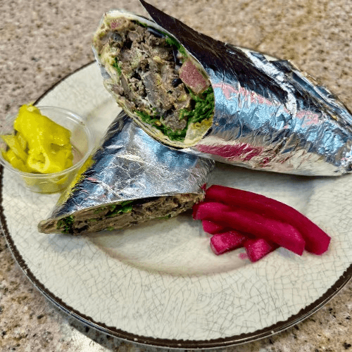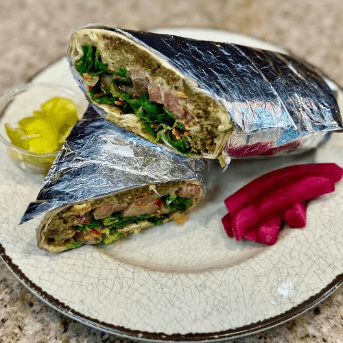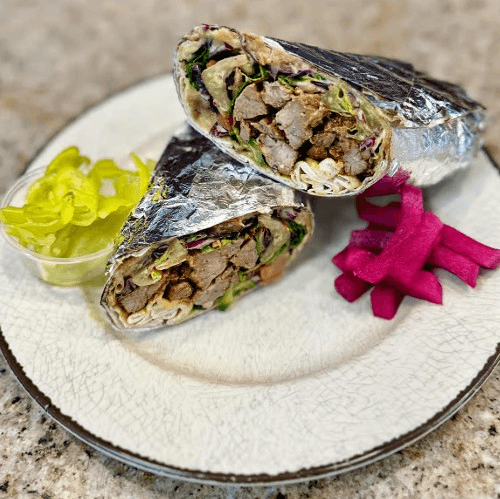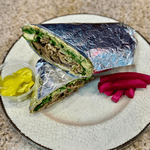 a mouthwatering medley of flavors wrapped in a large, fluffy pita bread. featuring tender slices of succulent beef shawarma with our creamy tzatziki sauce , topped with crisp salad greens and a generous drizzle of our house-made tzatziki