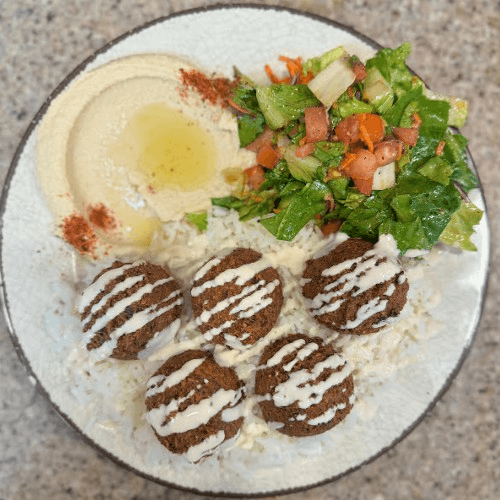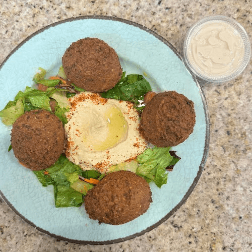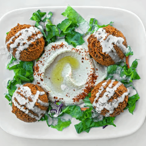 Four golden, crispy falafels served with a drizzle of rich tahini and a side of creamy hummus. A perfect start to your meal, blending the earthy flavors of chickpeas with the nutty smoothness of tahini.