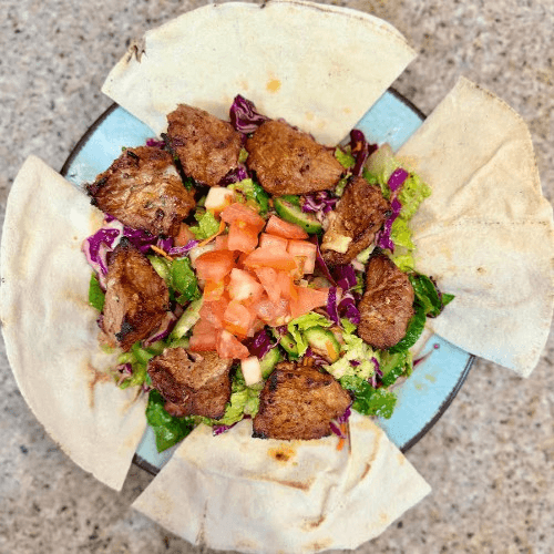 Savory beef shawarma atop a bed of our House Salad, a crisp and refreshing blend of fresh romaine lettuce, crunchy carrots, crisp cucumber slices, and vibrant red cabbage. Drizzled with our signature house-made vinaigrette, crafted from the finest ingredients