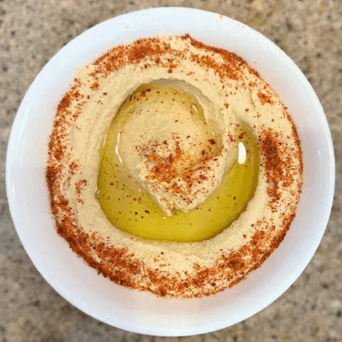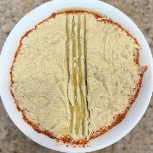 a velvety blend of chickpeas, tahini, garlic, and lemon juice, expertly crafted to perfection. Delight your palate with its creamy texture and rich, earthy flavors, complemented by a drizzle of extra virgin olive oil and a sprinkle of paprika
