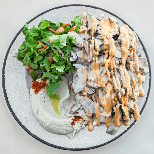 tender, spiced chicken shawarma served atop a bed of fragrant rice, complemented by creamy hummus, a crisp, fresh salad, and warm pita bread. Topped with our signature shawarma sauce, this dish delivers a harmonious blend of savory, tangy, and spicy flavors.