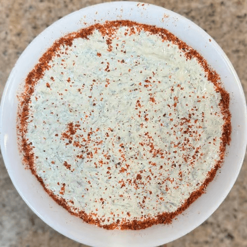 a traditional Greek yogurt dip infused with crisp cucumber, garlic, dill, and a hint of lemon juice. Creamy yet light, this zesty dip is the perfect accompaniment to our fresh pita bread or as a delightful complement to your favorite Mediterranean dishes