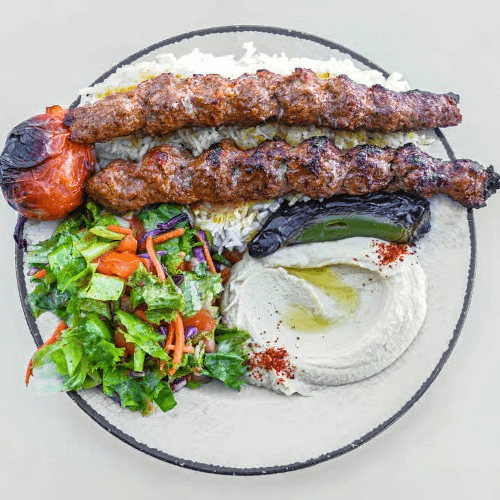 Featuring perfectly seasoned and grilled beef lula kababs. Served with a generous portion of aromatic rice, creamy hummus, fresh salad, grilled tomatoes, and grilled jalapeño accompanied by warm, fluffy pita bread
