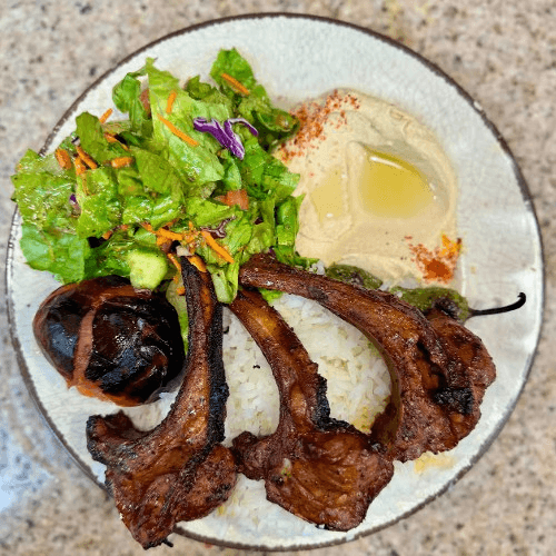 Features tender, perfectly seasoned lamb chops grilled to perfection Accompanied by fluffy jasmine rice, creamy hummus, and a crisp side salad with a grilled tomato , jalapeno complete the experience with warm, soft pita bread