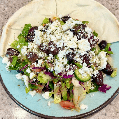 Crisp lettuce, juicy tomatoes, crunchy cucumbers, and briny Kalamata olives come together in perfect harmony, tossed with creamy feta cheese and a sprinkling of fragrant oregano. Drizzled with our signature Greek dressing, made with extra virgin olive oil and tangy lemon juice, each bite is a burst of flavor that satisfies the senses