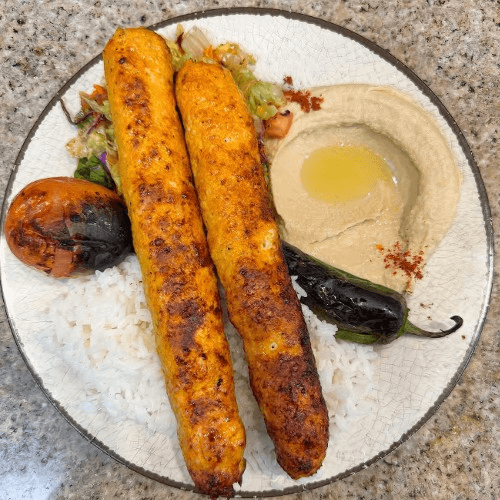 Featuring seasoned and grilled chicken lula kababs, served alongside fluffy rice, creamy hummus, and a refreshing salad. Juicy tomatoes and spicy jalapeños add a vibrant burst of flavor, while warm pita bread completes this delectable meal.