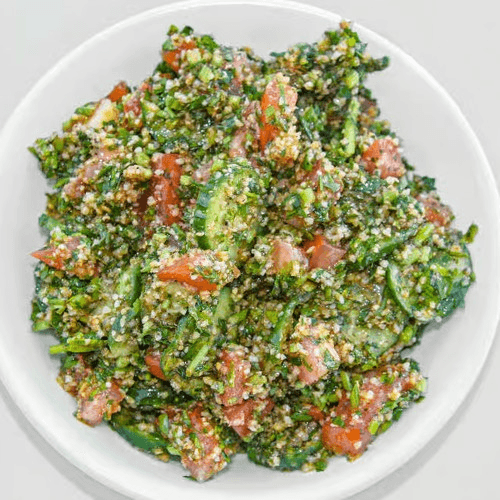 Generous portions of finely chopped parsley, juicy tomatoes, crisp cucumbers, with bulgur wheat and dressed in a tangy blend of lemon juice, extra virgin olive oil and our home made seasoning