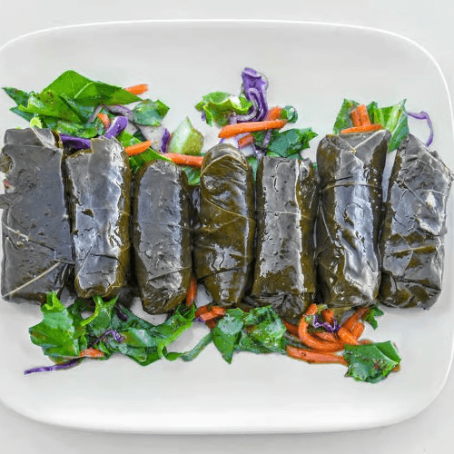 Grape Leaves delicately filled with a tantalizing blend of aromatic rice, sautéed onions, fresh mint, dill, zesty lemon juice, and premium olive oil. Each bite is a burst of Mediterranean flavors