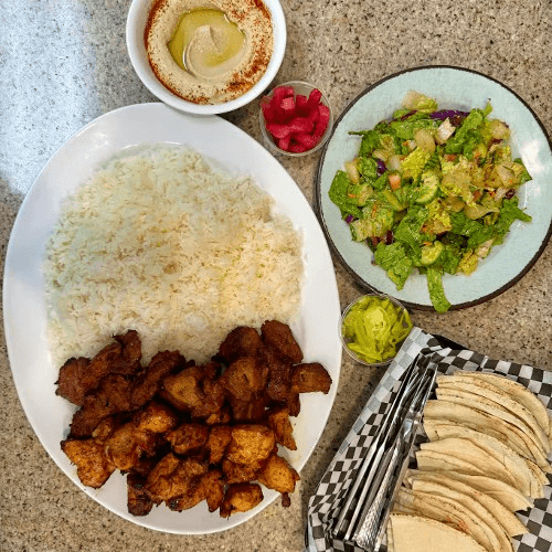 featuring tender, juicy chicken seasoned to perfection. Served alongside fluffy rice, creamy hummus, a fresh, crisp salad, and warm pita bread. Complete your meal with a side of our zesty garlic sauce for an extra burst of flavor.