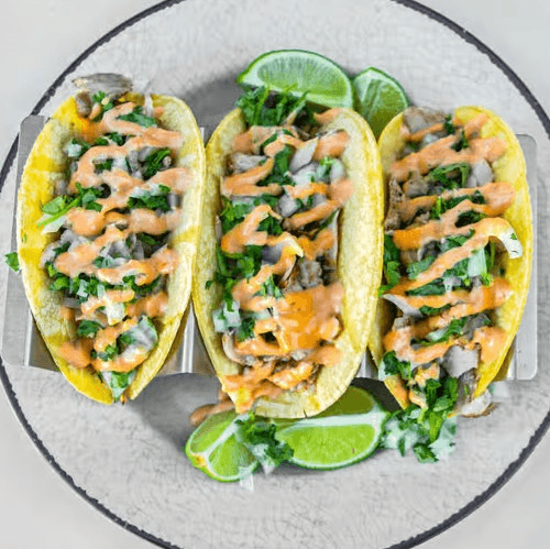 thinly sliced marinated chicken shawarma in warm corn tortillas, topped with a medley of crisp onions, fresh cilantro, and a drizzle of our signature secret sauce and a splash of lime for a zesty finish that elevates every bite to new heights that’s sure to tantalize your taste buds.
