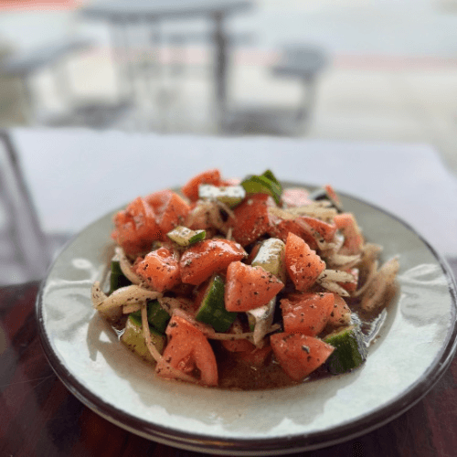 Featuring generous cuts of ripe tomatoes, crisp cucumbers, and zesty onions, this vibrant medley is enhanced with fragrant basil and mint leaves, creating a symphony of fresh flavors. Drizzled with extra virgin olive oil and a splash of tangy lemon juice, each bite offers a delightful burst of Mediterranean sunshine.