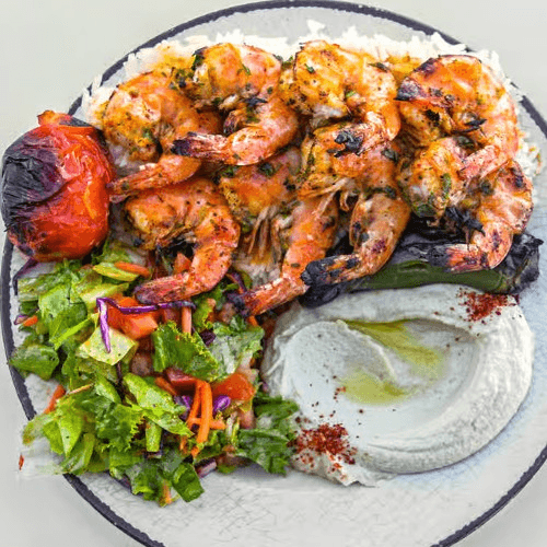 features succulent, marinated shrimp grilled to perfection and served on a bed of fluffy, seasoned rice. Accompanied by a generous serving of creamy hummus, a fresh salad of crisp greens, grilled tomatoes, jalapeños, and a warm, soft pita bread on the side.