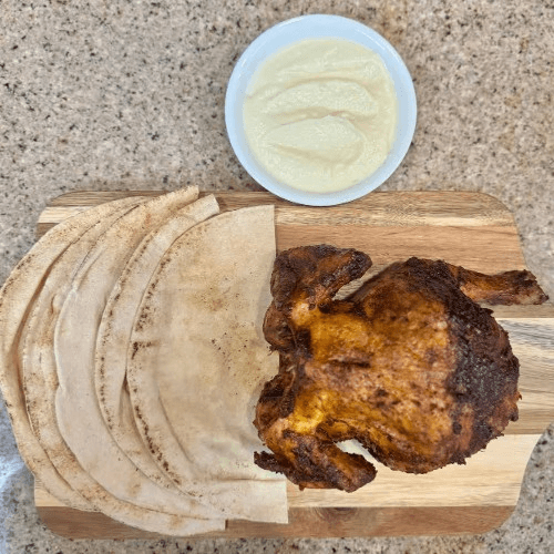 Succulent rotisserie chicken with crispy, seasoned skin, served alongside warm pita bread. Our homemade garlic sauce adds a zesty, creamy touch, perfect for dipping or drizzling. A flavorful trio that promises satisfaction in every bite