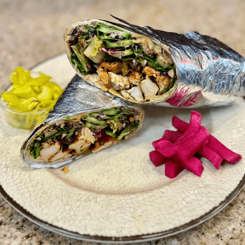 savory sensation wrapped in a large, fluffy pita bread. Juicy tenderness of chicken kabob each grilled to perfection and bursting with flavor. Topped with crisp salad greens and drizzled with our signature garlic sauce