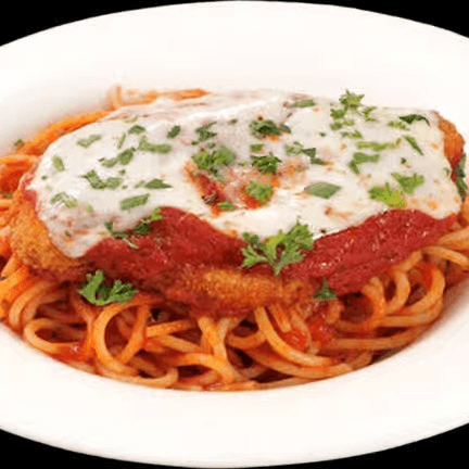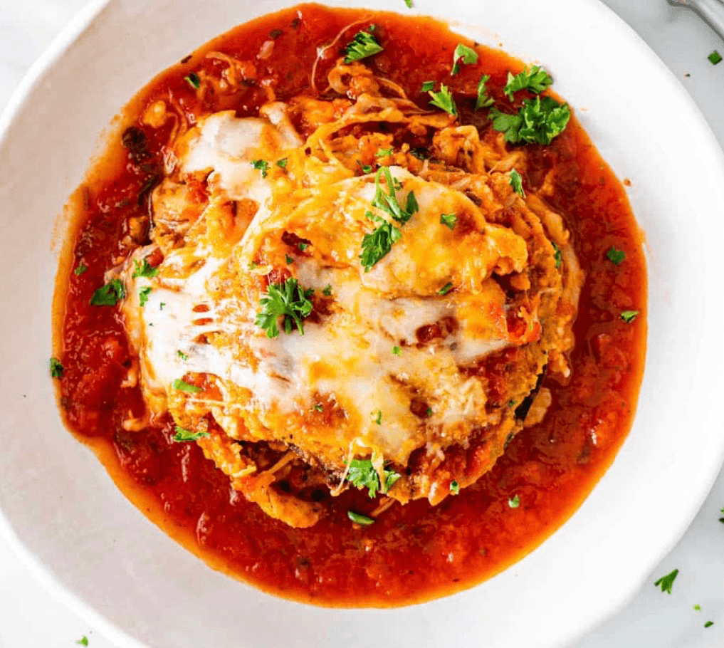 Breaded chicken with marinara sauce and melted mozzarella cheese