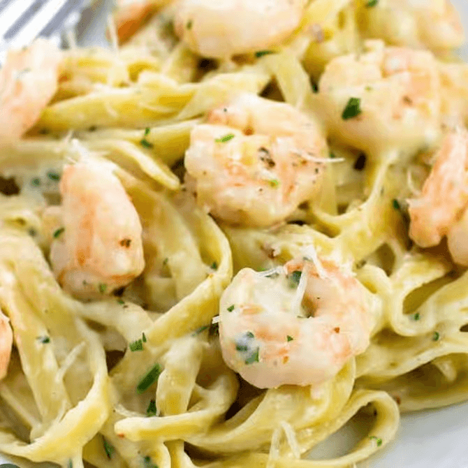 Sauteed shrimp tossed with pasta and served in a delicate white cream sauce