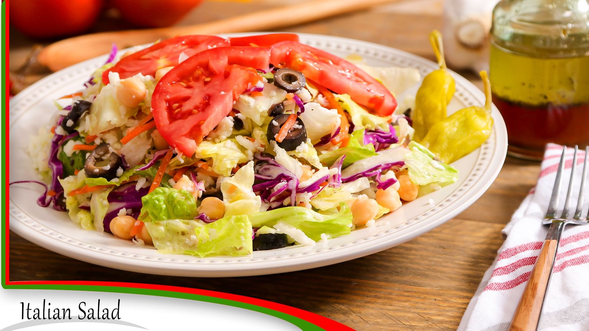Iceberg and romaine lettuce, red cabbage, pepperoncini, sliced tomatoes, and cherry peppers