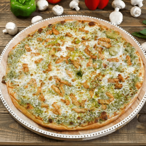 Diced chicken breast, home made pesto cream sauce and mozzarella cheese